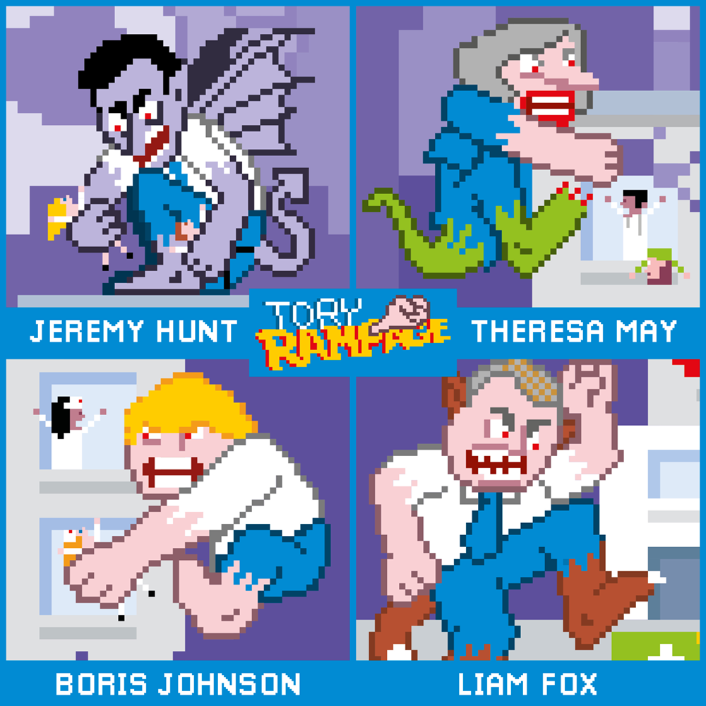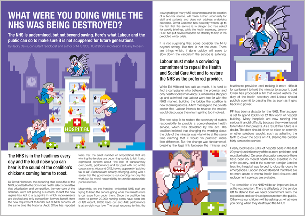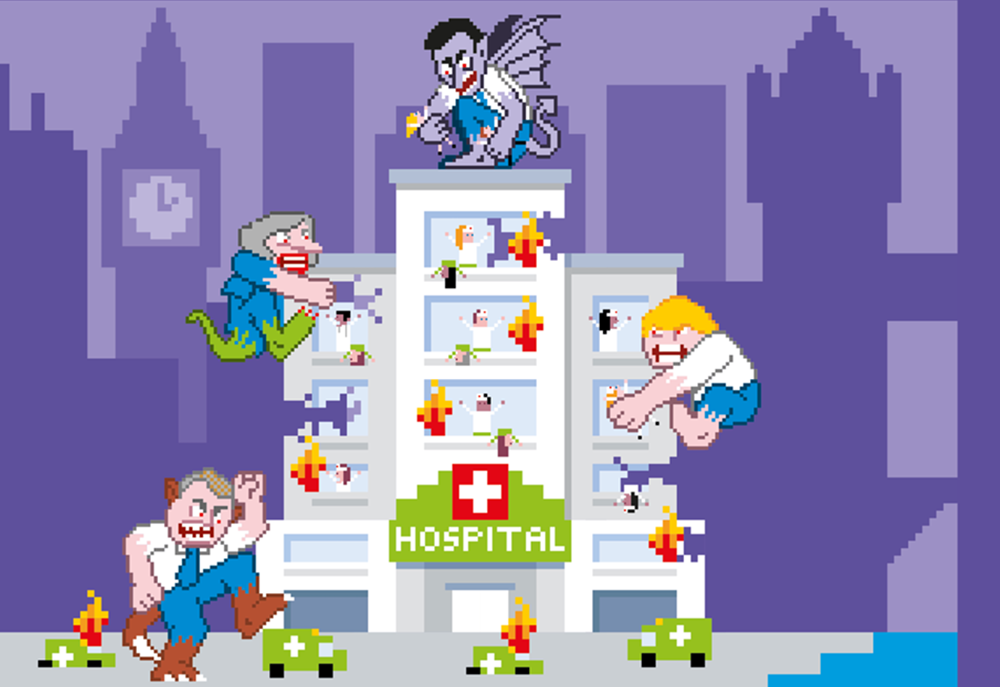 Political satire illustration and character design about privatisation of the NHS.